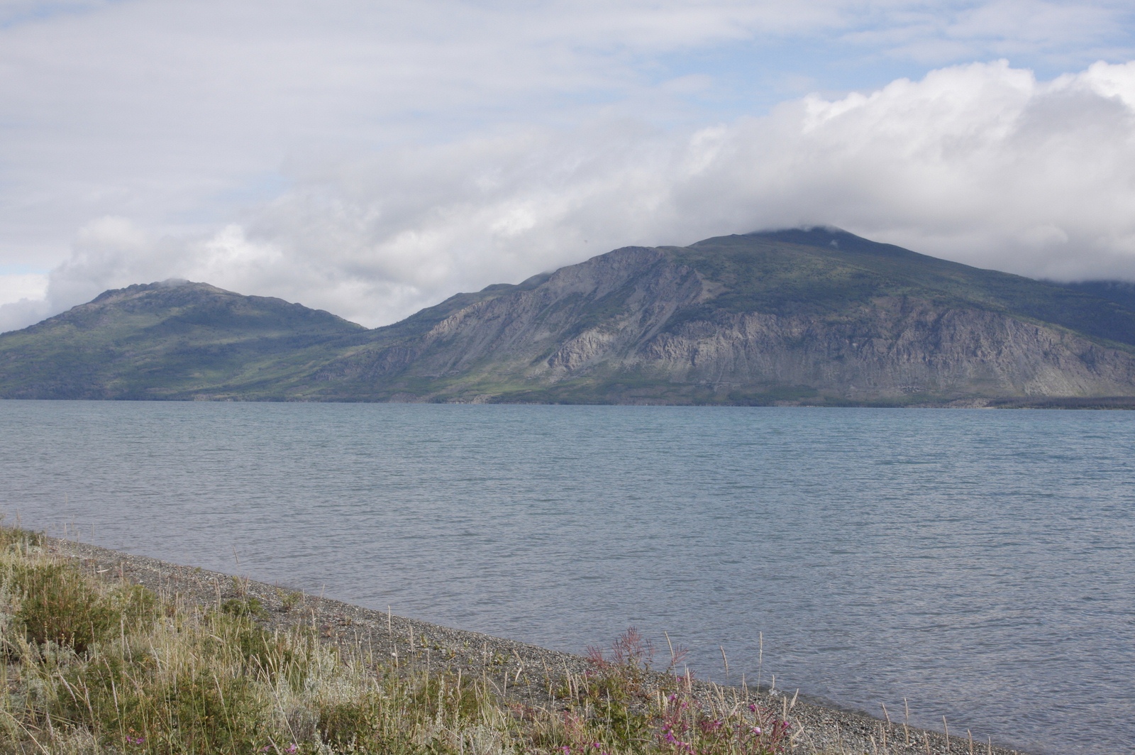 We are safely setup at the Riverview RV Park, North Pole, AK, just east of Fairbanks. The park is OK, but not nearly as nice as the last several places we've stayed. It will do. The drive up to here from Haines passes through some incredibly beautiful parts of BC and the Yukon. We were a bit late leaving Haines because I spotted a screw in one of the trailer tires, and had to get it fixed. Fortunately, the folks at Big Foot Service got us on our way quickly. We had a nice day, partly cloudy with lots of sunshine. We covet the sunshine as there hasn't been that much of it. Our day's destination was Kluane Lake / Congdon Creek CG, and it was a beauty. A dry camp, but wonderfully set along the shore of one of the most beautiful lakes we've seen yet. We got set up and were looking forward to our first campfire of the trip, when the sun disappeared and we heard the patter or falling raindrops; so, no campfire that night. In fact, we got a real downpour for several hours. Fortunately, when we awoke in the morning, it was beautiful. There was fresh snow on the mountain tops, and the sun was out in full force. Here is how it looked from our trailer: